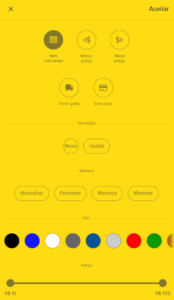 No caso do Mercado Livre, os filtros mudam também quando entramos em alguma categoria específica. Por exemplo, se estamos na categoria de roupas, surge no filtro a possibilidade de filtro por gênero, tamanho, cor, etc.
