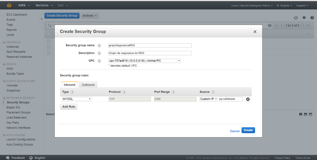 Neste momento, a máquina EC2 está pronta para ser usada, então falta apenas o banco de dados no RDS. O processo é similar ao EC2, ou seja, criar um grupo de segurança e depois a instância. Para criar o grupo de segurança: